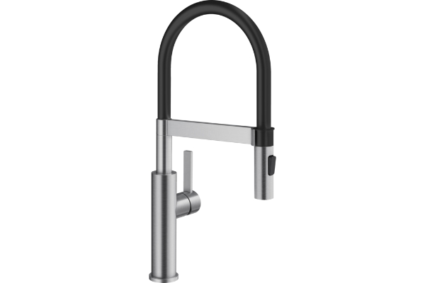 Blanco Sonea-S Flexo is a professional-style kitchen mixer tap combining brushed stainless steel with a flexible black hose. The dual-spray head allows for easy switching between a standard aerated stream and a powerful spray, simplifying both cooking and cleaning tasks. A magnetic holder ensures precise and secure docking of the hose after use.
