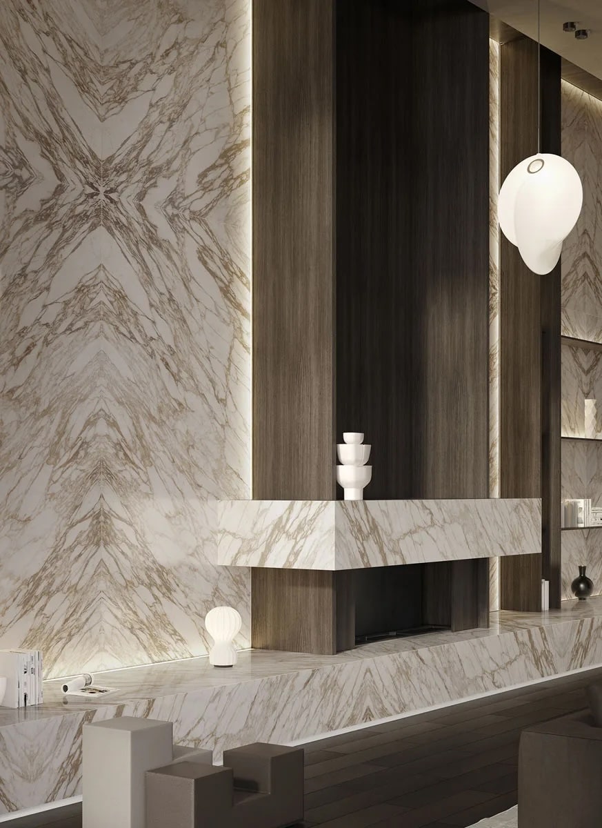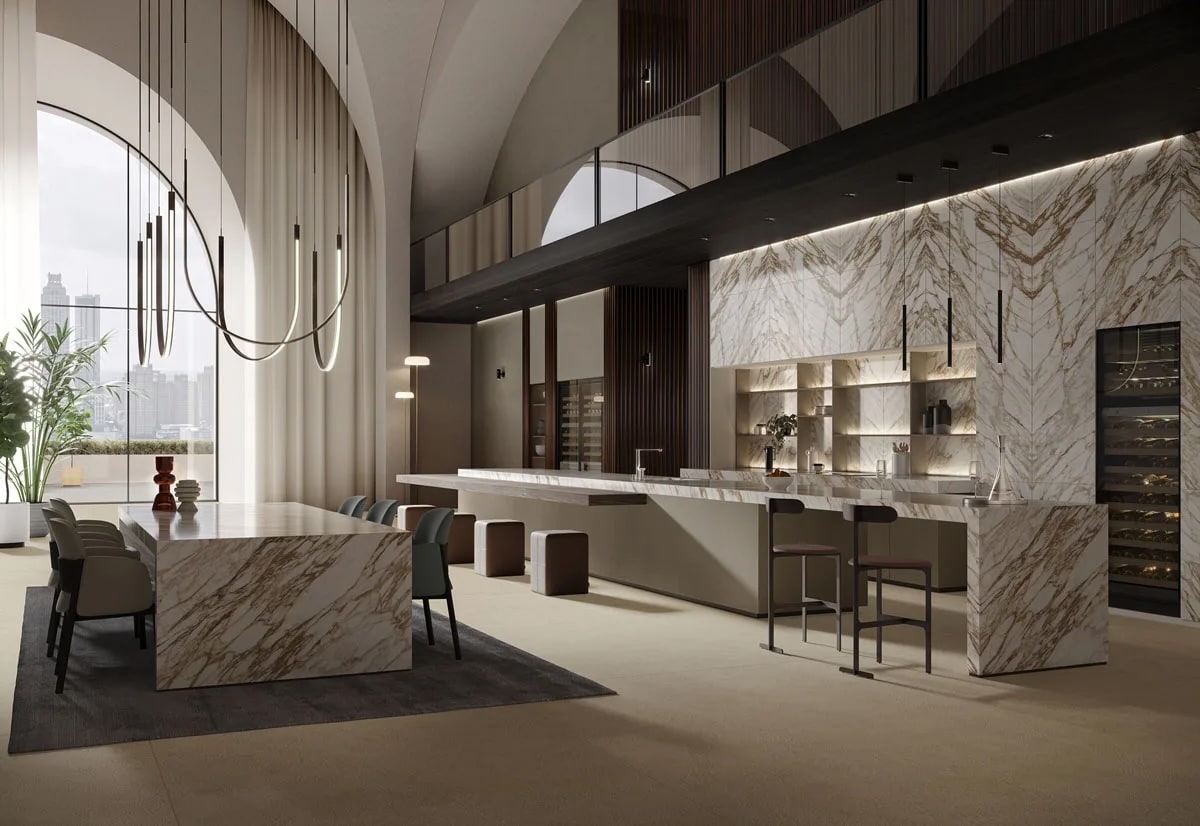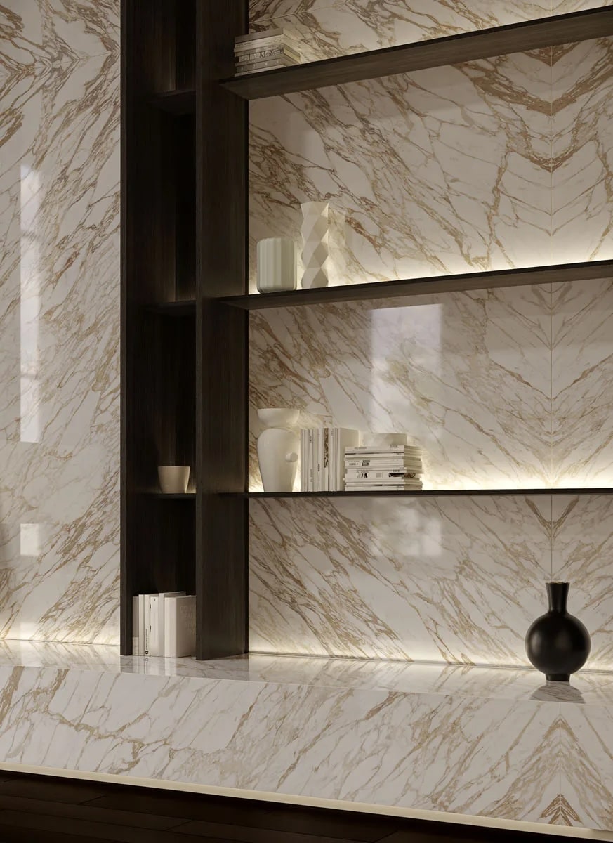 Arabescato Diva’s beautiful pattern pays tribute to one of the most iconic Italian marbles, celebrating the rarity of precious materials to create a striking visual impact. Its wonderful surface that features a light background with golden veining, blends refined design with technical innovation.